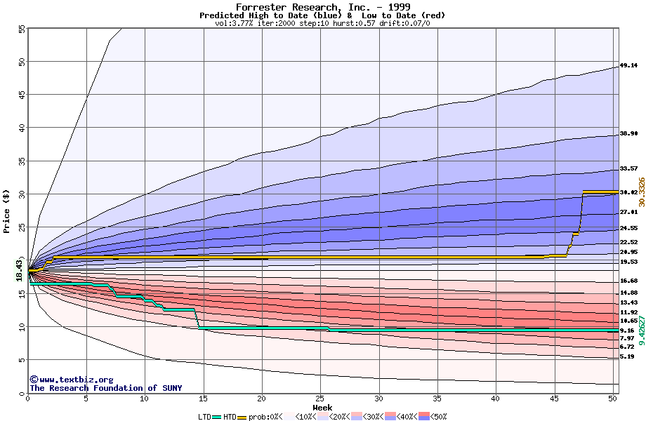 The high to date and low to date prices of the stock plotted against a random walk model for 1999 (what's this?).