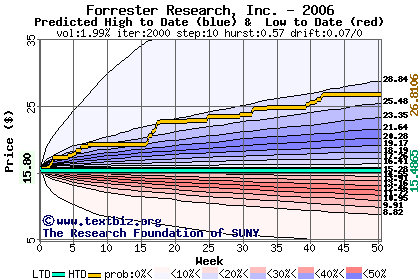 The high to date and low to date prices of the stock plotted against a random walk model for 2006 (what's this?).
