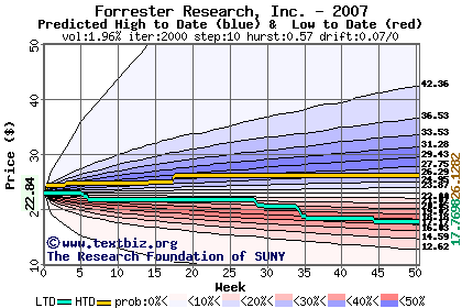 The high to date and low to date prices of the stock plotted against a random walk model for 2007 (what's this?).