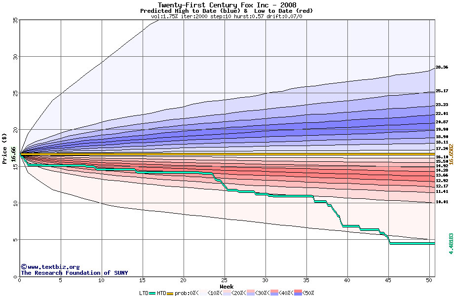 The high to date and low to date prices of the stock plotted against a random walk model for 2008 (what's this?).