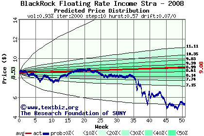 The high to date and low to date prices of the stock plotted against a random walk model for 2008 (what's this?).
