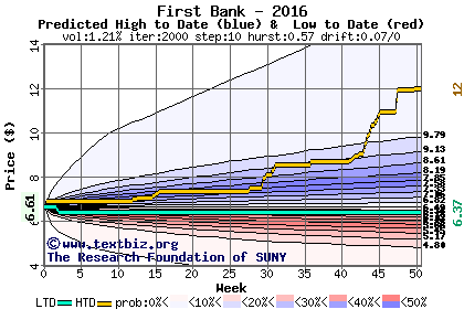 The high to date and low to date prices of the stock plotted against a random walk model for 2016 (what's this?).