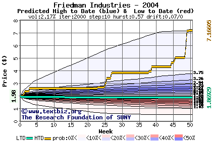 The high to date and low to date prices of the stock plotted against a random walk model for 2004 (what's this?).