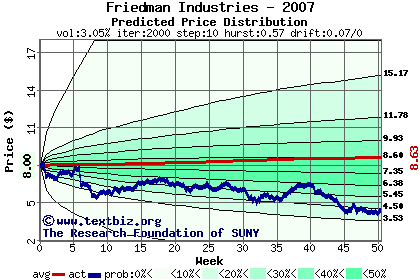 The high to date and low to date prices of the stock plotted against a random walk model for 2007 (what's this?).