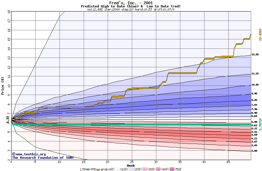 The high to date and low to date prices of the stock plotted against a random walk model for 2001 (what's this?).