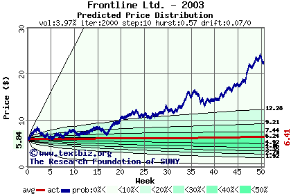 The high to date and low to date prices of the stock plotted against a random walk model for 2003 (what's this?).