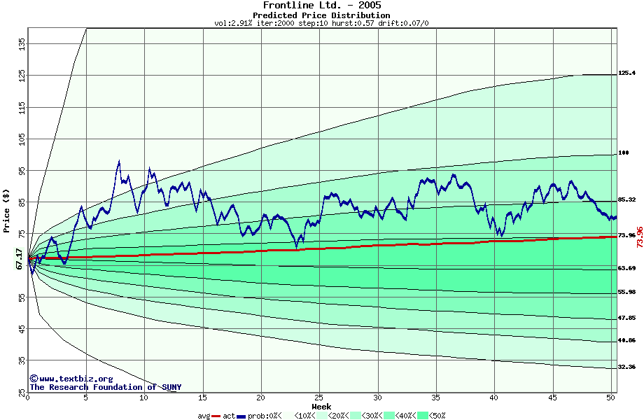The following graph plots the year-to-date performance of the stock for 2005 compared to the probability calculated by a random walk model.