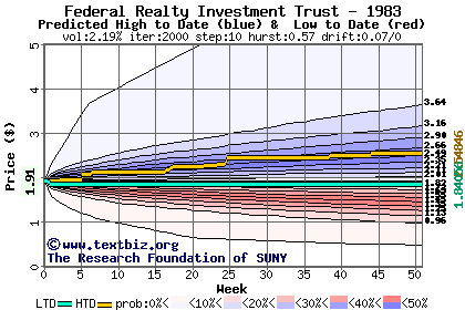 The high to date and low to date prices of the stock plotted against a random walk model for 1983 (what's this?).