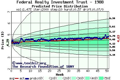 The high to date and low to date prices of the stock plotted against a random walk model for 1988 (what's this?).