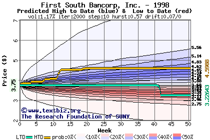 The high to date and low to date prices of the stock plotted against a random walk model for 1998 (what's this?).