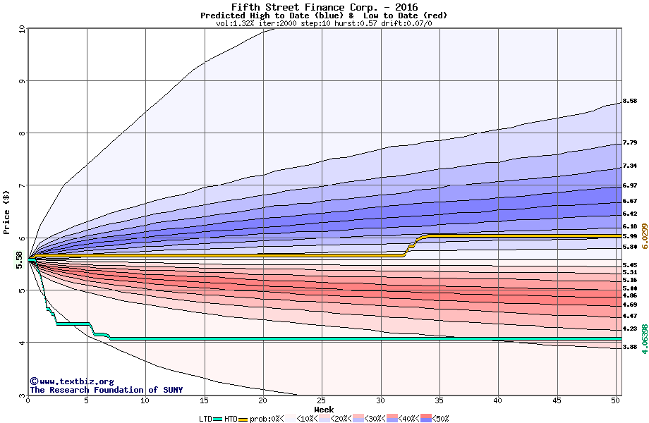 The high to date and low to date prices of the stock plotted against a random walk model for 2016 (what's this?).