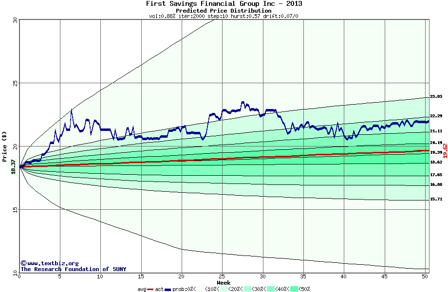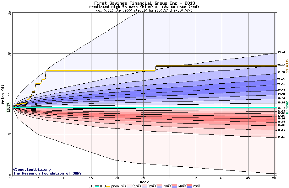 The following graph plots the year-to-date performance of the stock for 2013 compared to the probability calculated by a random walk model.