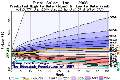 The high to date and low to date prices of the stock plotted against a random walk model for 2008 (what's this?).