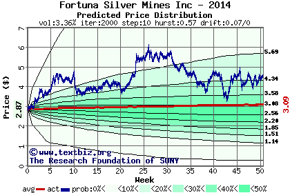 The high to date and low to date prices of the stock plotted against a random walk model for 2014 (what's this?).