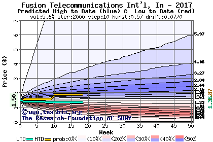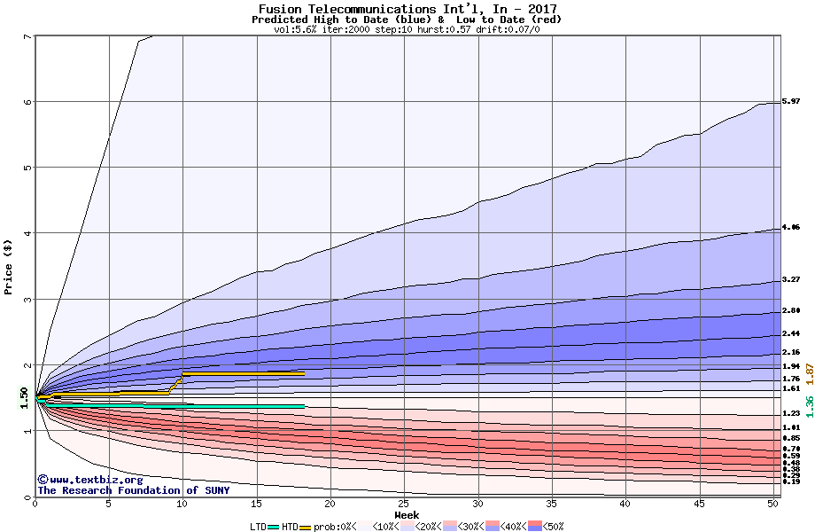 The high to date and low to date prices of the stock plotted against a random walk model for 2017 (what's this?).