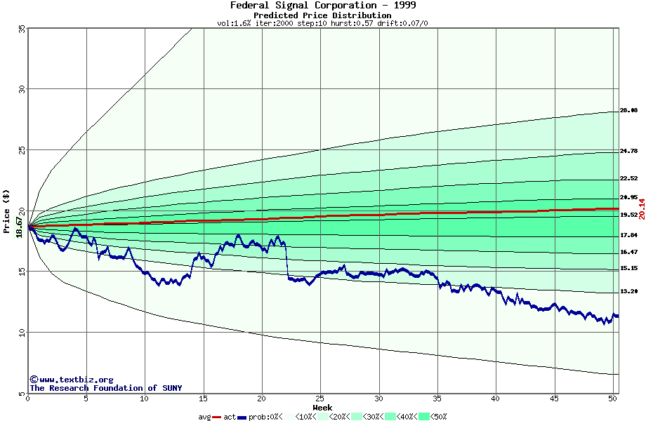 The following graph plots the year-to-date performance of the stock for 1999 compared to the probability calculated by a random walk model.
