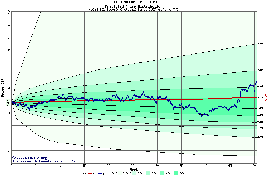 The following graph plots the year-to-date performance of the stock for 1998 compared to the probability calculated by a random walk model.