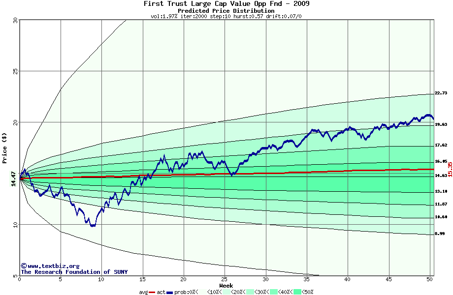 The following graph plots the year-to-date performance of the stock for 2009 compared to the probability calculated by a random walk model.