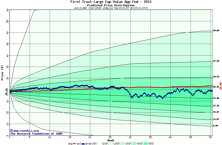 The following graph plots the year-to-date performance of the stock for 2011 compared to the probability calculated by a random walk model.