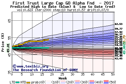 The high to date and low to date prices of the stock plotted against a random walk model for 2017 (what's this?).