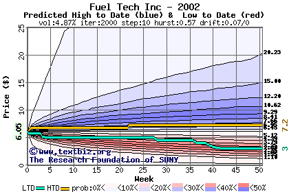 The high to date and low to date prices of the stock plotted against a random walk model for 2002 (what's this?).