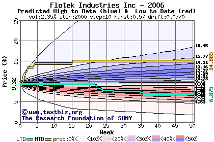 The high to date and low to date prices of the stock plotted against a random walk model for 2006 (what's this?).