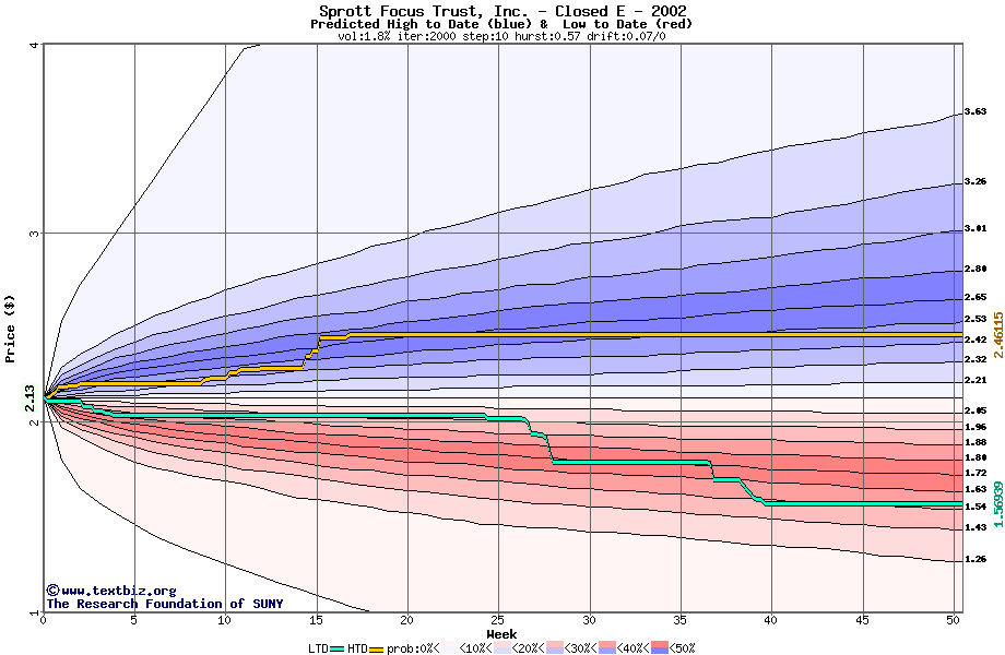 The high to date and low to date prices of the stock plotted against a random walk model for 2002 (what's this?).