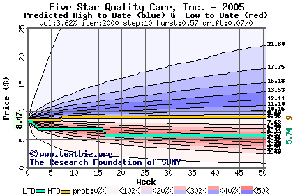 The high to date and low to date prices of the stock plotted against a random walk model for 2005 (what's this?).