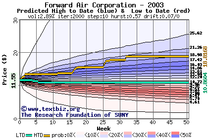 The high to date and low to date prices of the stock plotted against a random walk model for 2003 (what's this?).