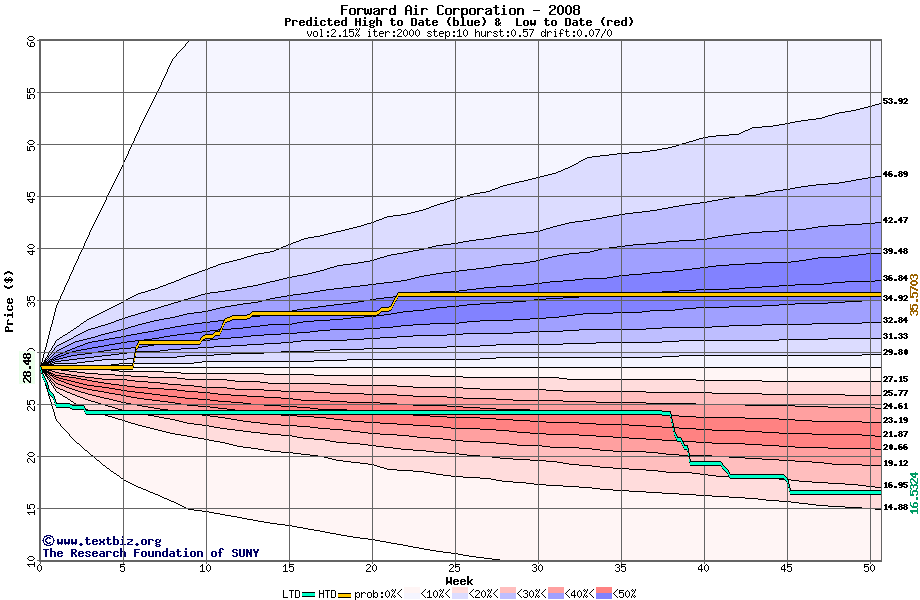 The high to date and low to date prices of the stock plotted against a random walk model for 2008 (what's this?).