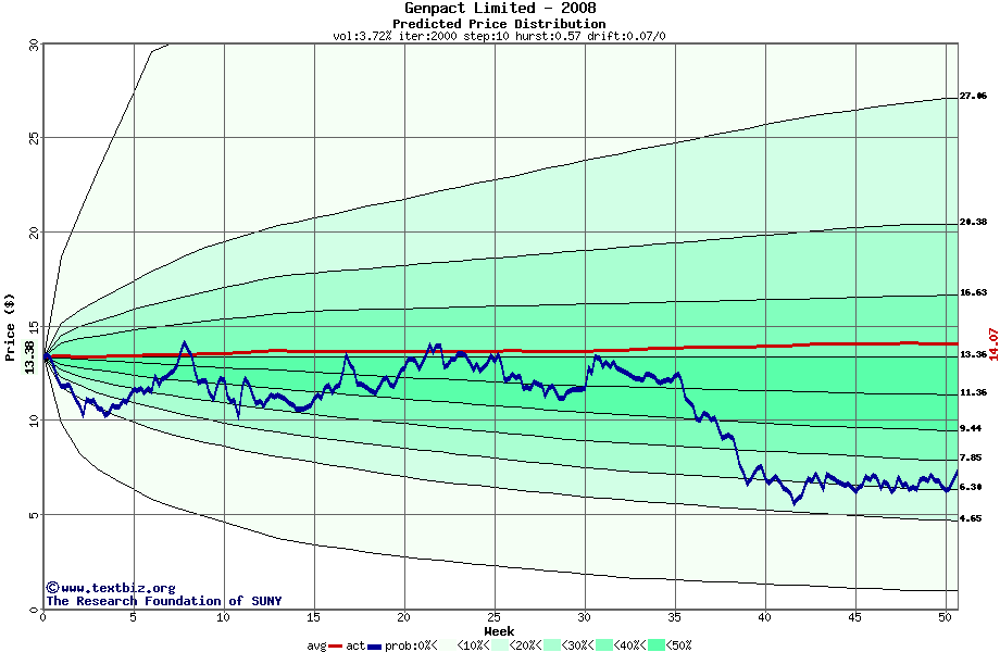 The following graph plots the year-to-date performance of the stock for 2008 compared to the probability calculated by a random walk model.