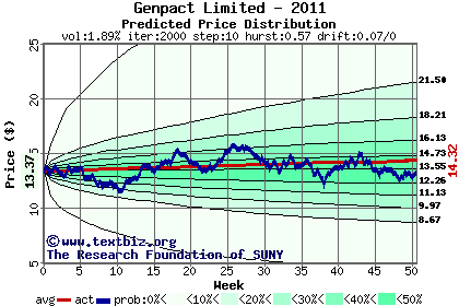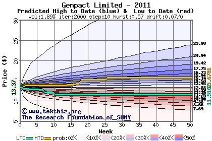 The high to date and low to date prices of the stock plotted against a random walk model for 2011 (what's this?).