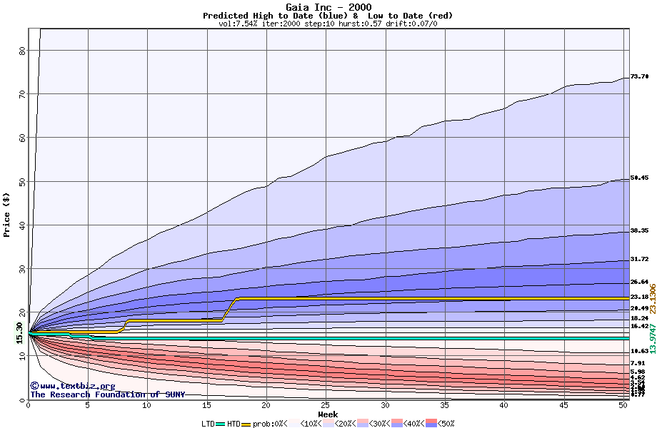 The high to date and low to date prices of the stock plotted against a random walk model for 2000 (what's this?).