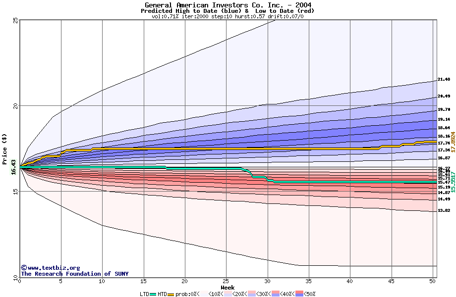 The high to date and low to date prices of the stock plotted against a random walk model for 2004 (what's this?).