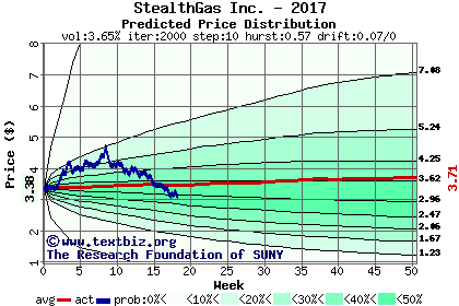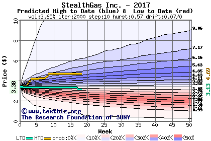 The high to date and low to date prices of the stock plotted against a random walk model for 2017 (what's this?).