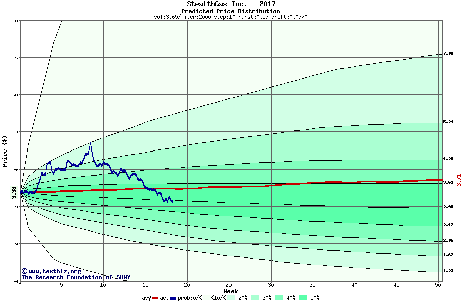 The following graph plots the year-to-date performance of the stock for 2017 compared to the probability calculated by a random walk model.
