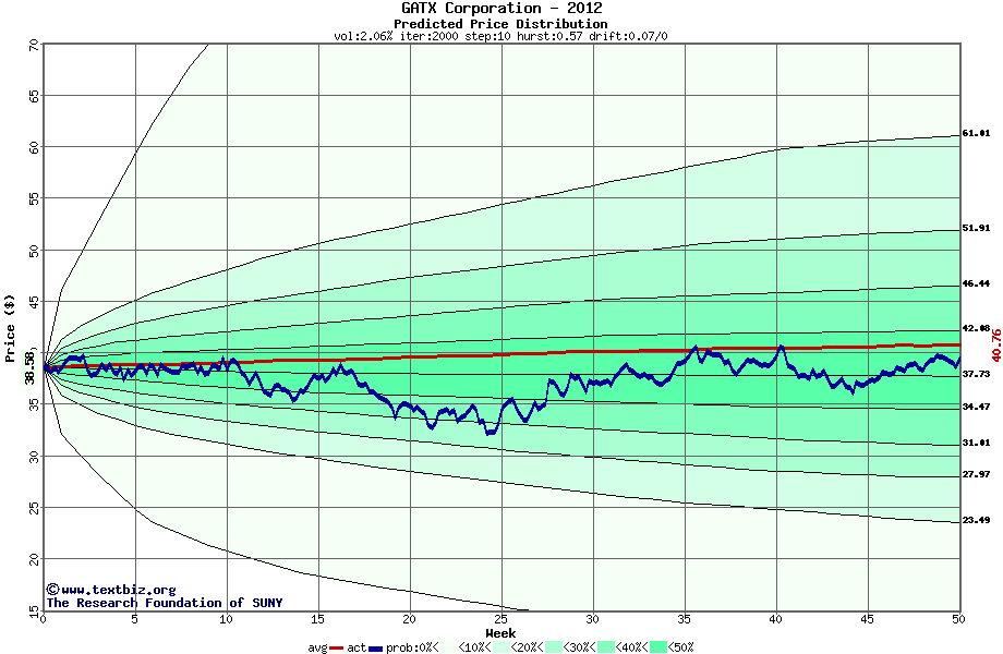 The following graph plots the year-to-date performance of the stock for 2012 compared to the probability calculated by a random walk model.