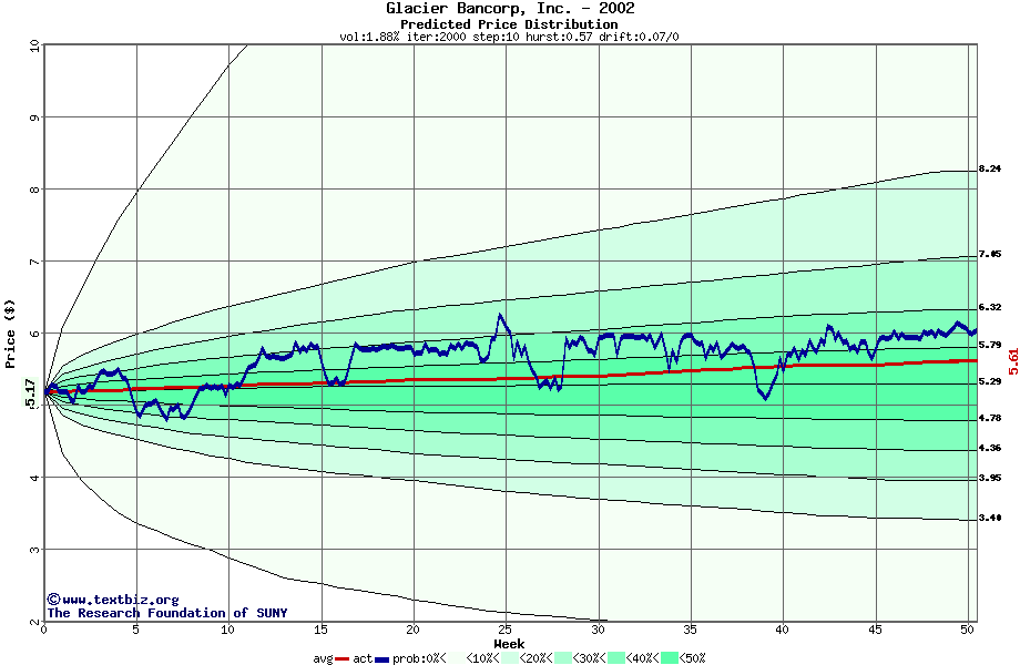 The following graph plots the year-to-date performance of the stock for 2002 compared to the probability calculated by a random walk model.