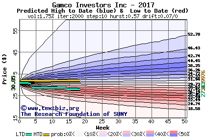The high to date and low to date prices of the stock plotted against a random walk model for 2017 (what's this?).