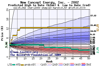 The high to date and low to date prices of the stock plotted against a random walk model for 2002 (what's this?).