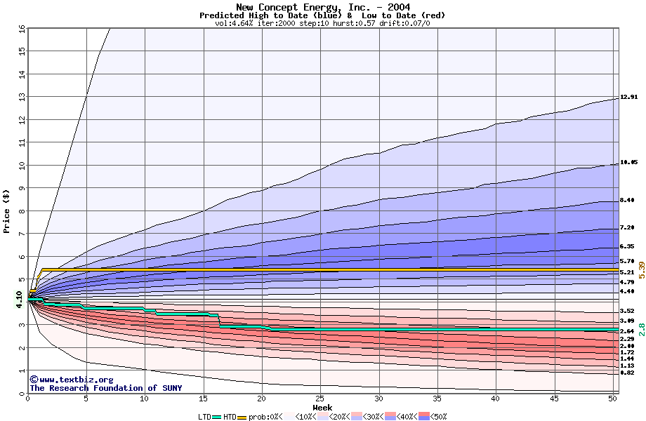 The high to date and low to date prices of the stock plotted against a random walk model for 2004 (what's this?).