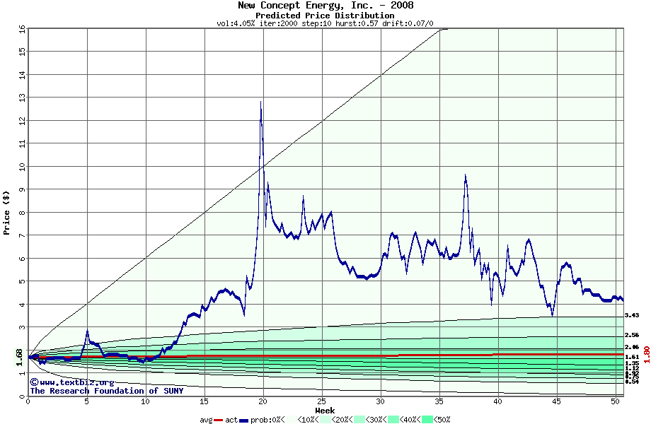 The high to date and low to date prices of the stock plotted against a random walk model for 2008 (what's this?).
