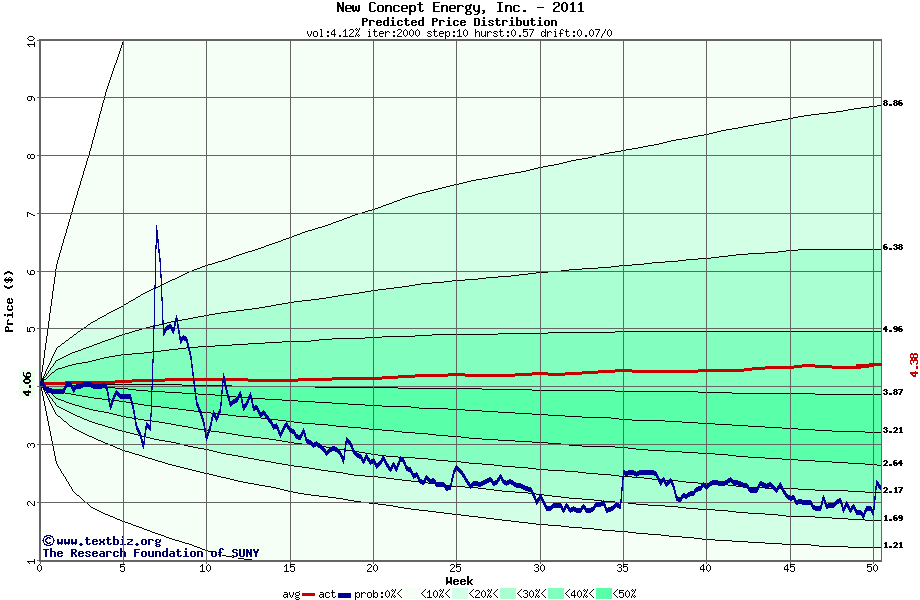 The high to date and low to date prices of the stock plotted against a random walk model for 2011 (what's this?).