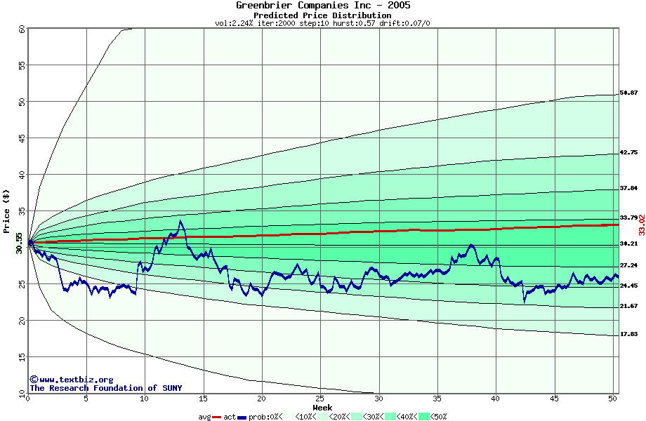The following graph plots the year-to-date performance of the stock for 2005 compared to the probability calculated by a random walk model.