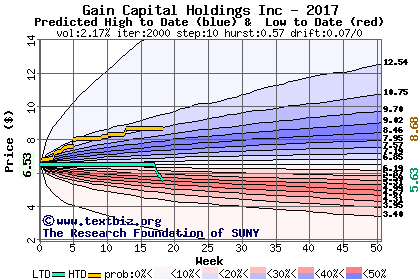 The high to date and low to date prices of the stock plotted against a random walk model for 2017 (what's this?).