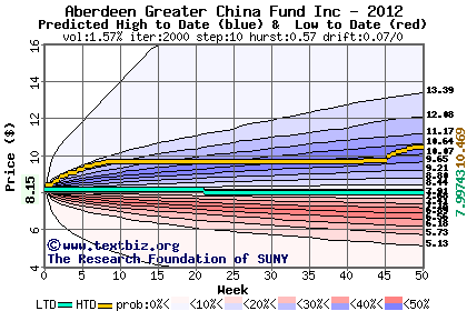The high to date and low to date prices of the stock plotted against a random walk model for 2012 (what's this?).