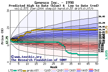 The high to date and low to date prices of the stock plotted against a random walk model for 1998 (what's this?).