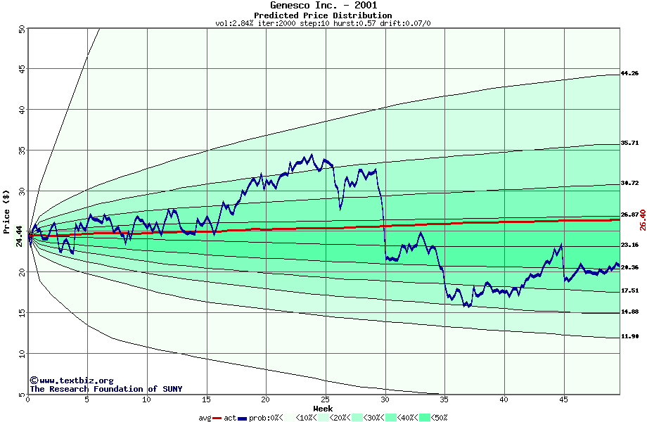 The following graph plots the year-to-date performance of the stock for 2001 compared to the probability calculated by a random walk model.
