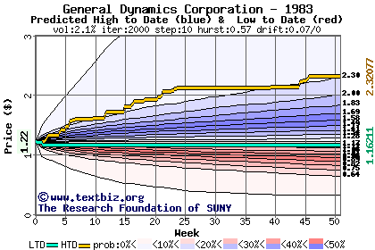 The high to date and low to date prices of the stock plotted against a random walk model for 1983 (what's this?).