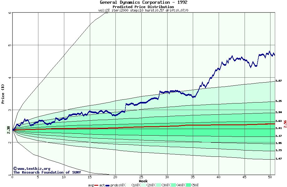 The high to date and low to date prices of the stock plotted against a random walk model for 1992 (what's this?).